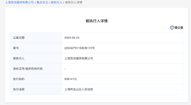 但自2022年起,品牌及母公司的经营状况似乎走了“下坡路”。2022年5月,笕尚服饰法定代表人更换为应军阳。同年6月,因未按期履行给付义务,公司及前法定代表人袁巴元被限制高消费。