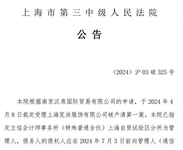 记者查询发现,MJstyle隶属于上海笕尚服饰有限公司(以下简称“笕尚服饰”),该公司目前已进入破产程序,被南京汉帛国际贸易有限公司申请破产清算,上海市第三中级人民法院已于今年4月8日裁定受理。