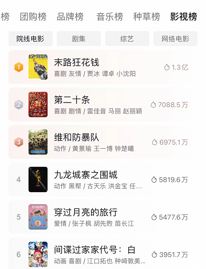 高赞内容中,《维和防暴队》主打双男主情谊、“内娱服役团”和大国骄傲,《九龙城寨》主打兄弟情、城寨奇观以及动作爽感,《末路狂花钱》靠喜剧人团建、极致的攒钱妙招与花式花钱的反差。这三部基本占据抖音影视热榜前列,从内容上看也基本与影片内容步调一致。