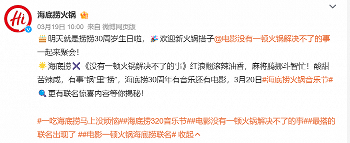 早在3月19日,海底捞30周岁生日之际,就官宣与《没有一顿火锅解决不了的事》达成合作,后续开启一系列联动活动:在淘票票购电影票可以获得海底捞锅底或菜品券,主创去海底捞线下门店快闪,打出“看完《火锅》吃火锅”这种极具社交属性的标签。