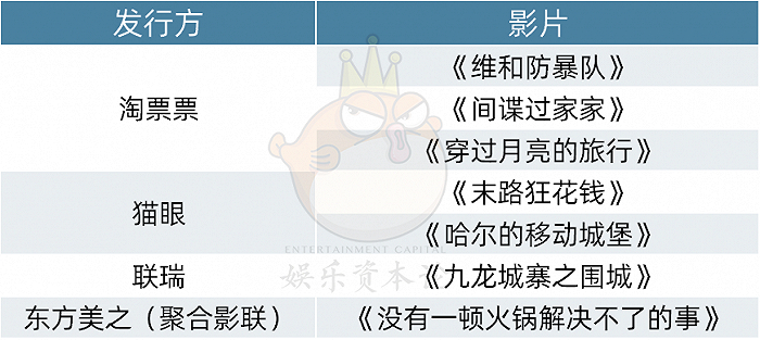 宣发大战提前打响。除《猪猪侠》外的七部重点影片背后,站着淘票票、猫眼、联瑞和聚合影联四家实际发行方。一位影城经理告诉娱乐资本论(id:yulezibenlun),猫淘都是捆绑几部影片谈排片,这次他接受了阿里的排片要求,《维和》《间谍》和《月亮》分别要了28%、20%和16%,剩下的空间只够接受联瑞要求的《九龙城寨》25%了。