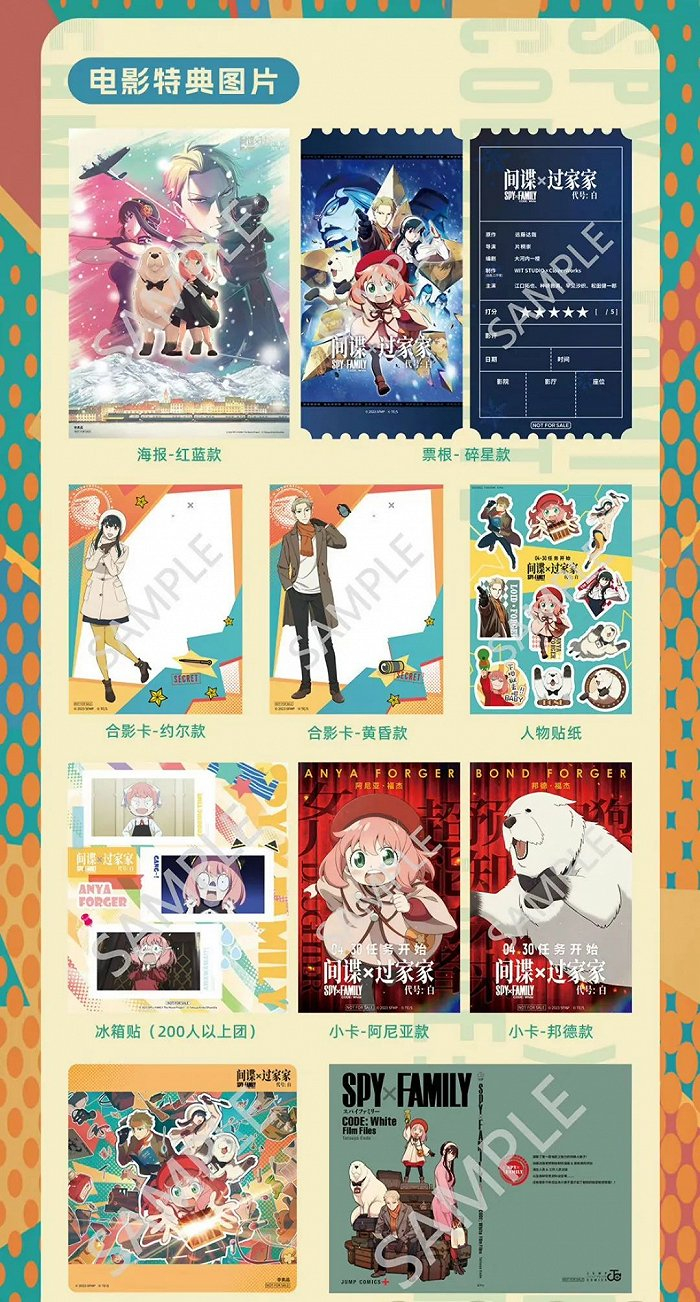 此次《间谍过家家》也准备了数十种限定特典,前期以想看数新增5万或7万解锁,开启预售后以预售成绩提高来解锁新的特典,目前已解锁第九款限定特典,整套特典包括邮票贴纸、亚克力杯垫、合影透卡等多种形式,大多在微博抽奖送出。