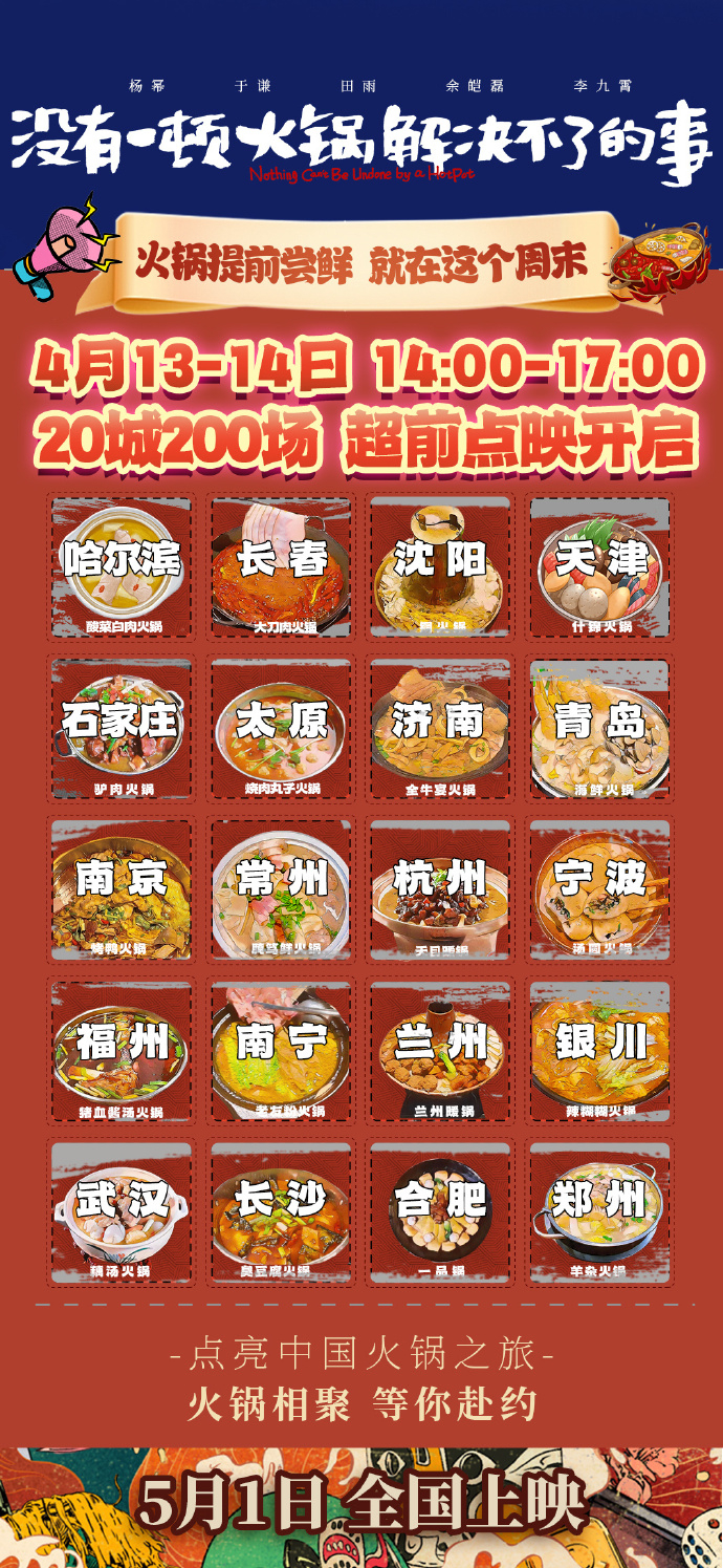 《没有一顿火锅解决不了的事》最早官宣点映,颇有仪式感地选了20座有特色火锅的城市,避开北上广深和川渝,选择了中东部的二线省会城市,开200场。首轮释出还不错的口碑后,第二轮扩大到50城2500场,同步与海底捞联动送火锅券,规模扩大,口碑不再可控,逐渐出现两极,目前点映及预售票房刚过1000万,首日排片也仅有8%左右。