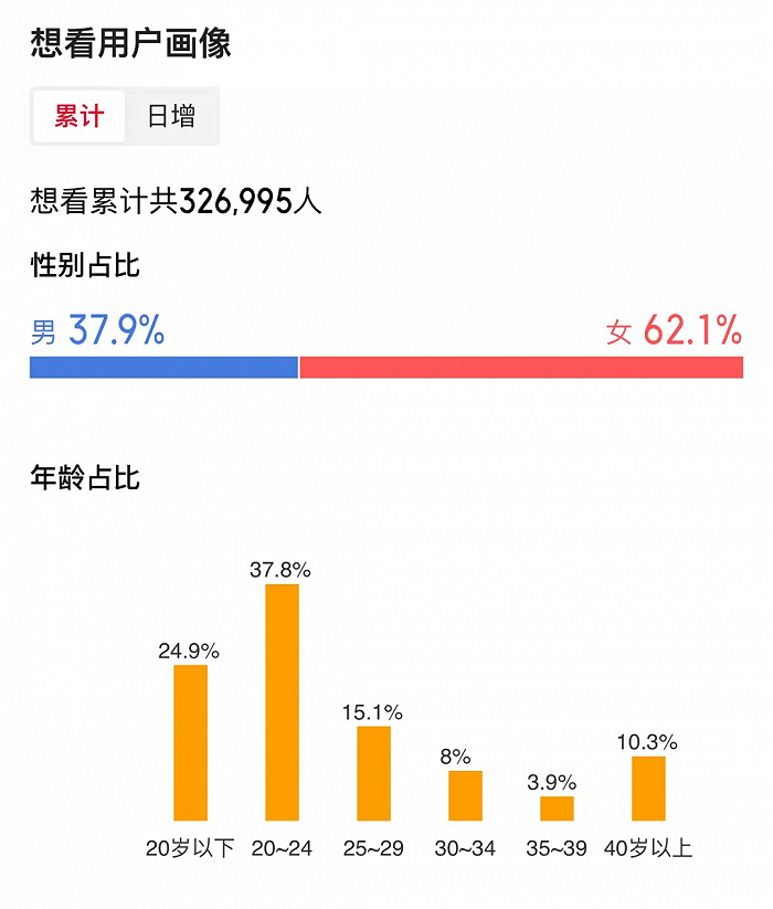 日本动画电影从去年的《铃芽之旅》《灌篮高手》展现出强劲的票房潜力,且这种潜力也是国内电影市场一直希望抢占的年轻用户。猫眼专业版显示,《哈尔的移动城堡》在五一档中20-24岁的年轻用户占比最高,达40.2%。而《间谍过家家》想看画像中,24岁以下用户也达到60%以上。