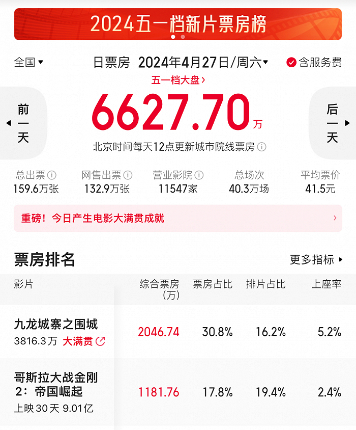 《九龙城寨》起势较晚,却是目前唯一真正靠点映口碑显出“黑马”气质的作品。一开始百城点映城市都比较下沉,也没有选择粤语区两广省的全部城市。但因为观影临场感强,兄弟情的离场感也不错,第二轮点映很快扩大到全国范围,在4月27日打败上映了一个月的哥斯拉,成为日票房冠军,目前预售(含点映)票房超过5000万,从半个月前的倒数逆袭成档期第一。