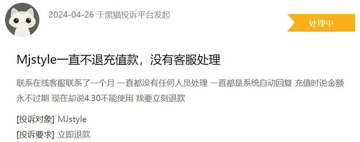 有消费者称,自己在MJstyle的储值余额为4342.60元,其中可退款部分为2895元,此前充值赠送的1447.6元无法退还。事发后,她一直尝试联系小程序端人工客服。4月23日17时许,客服同意为其进行退款登记,但也表示“当前储值卡退款处理时效可能较长,暂无法确认具体时效”。此后,该消费者多次要求填写退还余额的银行卡号,但客服仅表示“目前查看到您已经登记了,后续会有专员进行处理”,之后便没有下一步反馈。