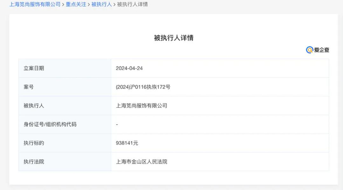 但自2022年起,品牌及母公司的经营状况似乎走了“下坡路”。2022年5月,笕尚服饰法定代表人更换为应军阳。同年6月,因未按期履行给付义务,公司及前法定代表人袁巴元被限制高消费。