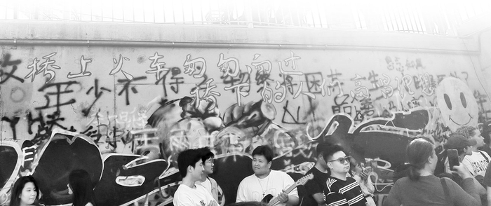 晓志告诉记者,早在一年前,他就和一个朋友在涂鸦桥下演出,“那时只有我们俩,一把吉他、一个鼓,就能在桥下唱一个晚上。”慢慢的,晓志认识了当地越来越多志同道合的人,今年3月,涂鸦桥乐队正式成立,并于每周六晚上在涂鸦桥下免费演出。
