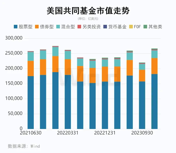 从美国基金共同基金整体的规模走势来看(包含ETF市值),2023年四季度的整体规模超过了26万亿美元,与21年四季度的市值规模高点相当。根据基金分类来看,股票型共同基金市值最大,已超过18万亿美元;债券型基金次之,达到5.28万亿美元;混合型基金市值为2.54万亿美元。