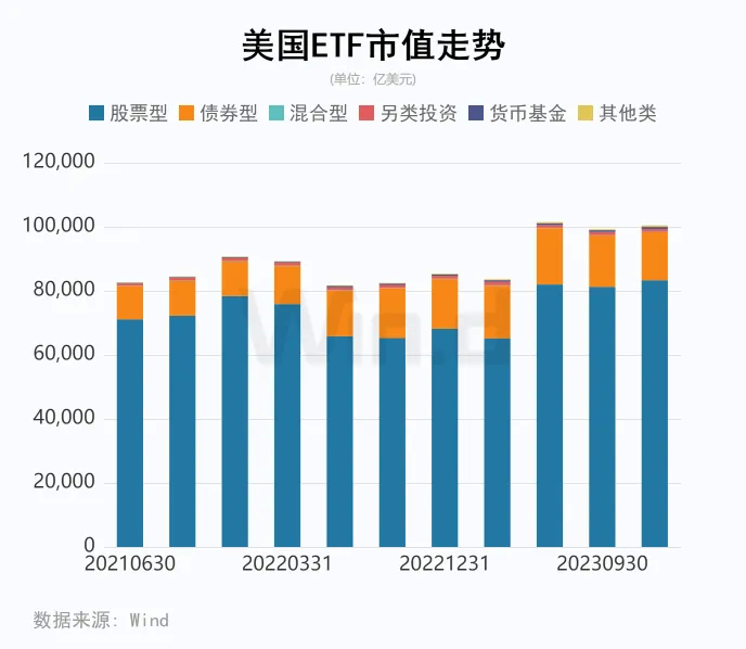 将ETF市值单独统计来看,2023年四季度美国ETF规模已超过10万亿美元,占到了整体共同基金规模的38%。其中股票型ETF规模为8.33万亿美元,剩下主要为债券型ETF,市值在1.5万亿美元。