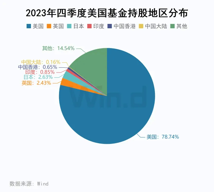 根据2023年四季度数据,美国基金的持股地区仍然集中于美国,占比78.74%。美国以外的地区配置比较分散,配置占比最大的2个地区:日本、英国也仅占到了2.63%、2.43%。中国香港、中国大陆的股票配置分别占到了0.65%、0.16%,而印度占比达到0.85%。