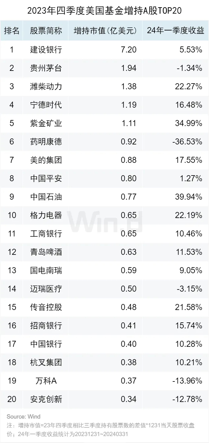 2023年四季度美国基金增持A股市值的前三位为建设银行、贵州茅台、潍柴动力(16.4,0.00,0.00%)。23年四季度最多增持的股票,在24年一季度涨跌幅显示,前20支增持A股的中位数收益达到10.37%,强于沪深300在一季度的收益率3.6%。23年四季度增持最多的前20支A股中,有14支在一季度收益强于沪深300,相对胜率达到70%。