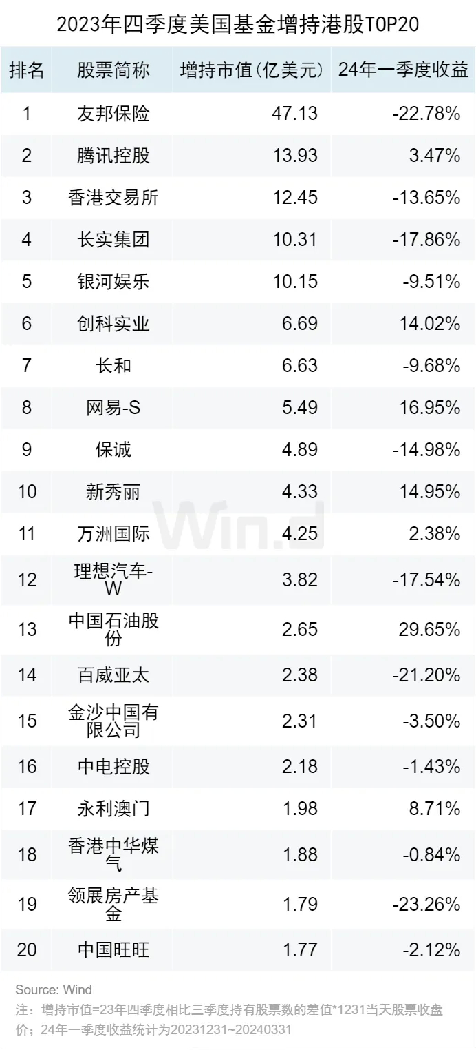 2023年四季度美国基金重点增持港股前三位为友邦保险、腾讯控股、香港交易所(250.2,3.40,1.38%)。从23年四季度最多增持股票在24年一季度的涨跌幅来看,前20支重点增持港股的中位数收益为-2.81%,与恒生指数(17651.15,366.61,2.12%)在一季度的收益率-2.95%十分近似。23年四季度增持最多的前20支港股有10支在24年一季度收益强于恒生指数,相对胜率50%。