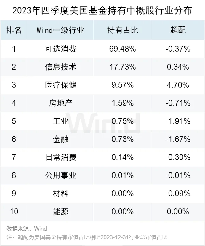 从美国基金持有中概股的行业分布来看,主要集中于可选消费行业,市值占比分别达到了69.48%。与2023年四季度中概股市场整体行业总市值占比相比,美国基金超配最多的行业为医疗保健。