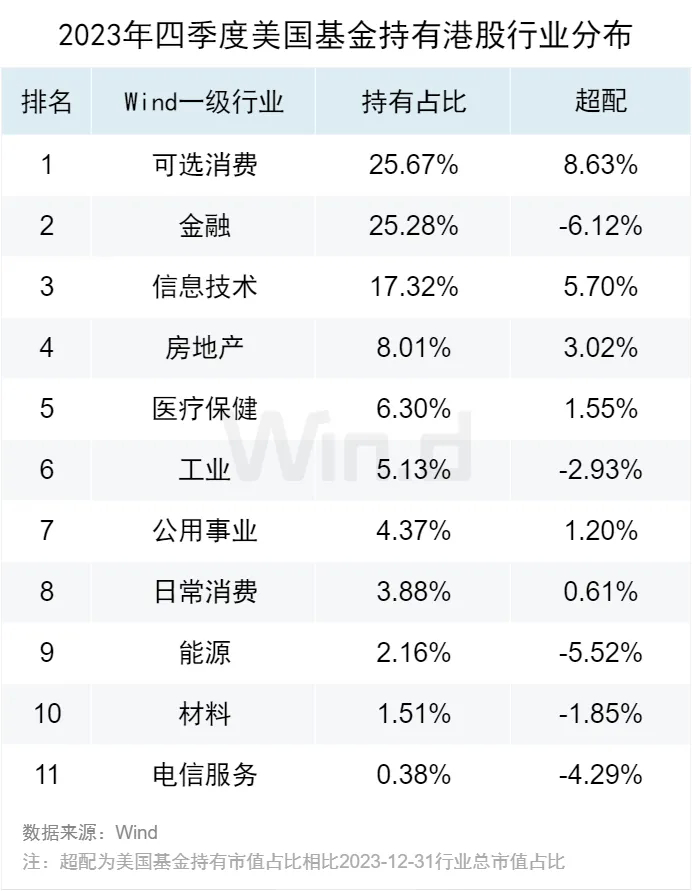 从美国基金持有港股的行业分布主要集中于可选消费、金融、信息技术,市值占比分别为25.67%、25.28%、17.32%。与2023年四季度港股市场整体行业总市值占比相比,美国基金超配最多的行业为可选消费、信息技术。