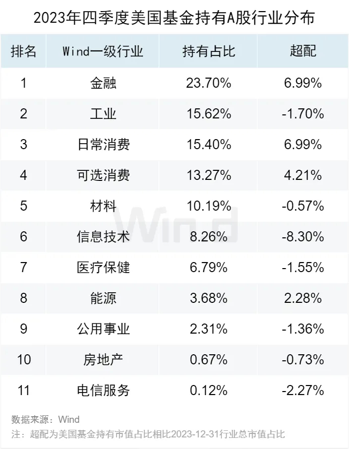 从美国基金持有A股的行业分布来看,主要集中于金融、工业、日常消费行业,市值占比分别为23.7%、15.62%、15.4%。与2023年四季度A股市场整体行业总市值占比相比,美国基金超配最多的行业为金融、日常消费。