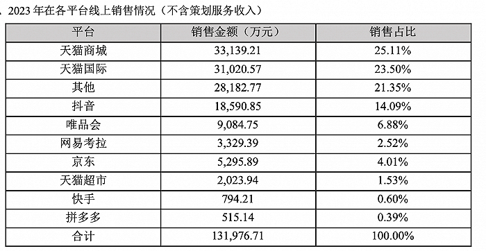 从母婴领域起步,目前若羽臣已涉足大健康、美妆个护、食品饮料等多个快消品领域。据财报披露,2023年该公司在天猫平台(天猫商城、天猫国际、天猫超市)的销售占比达到5成,这也意味着淘系之外的营收占比已接近一半。