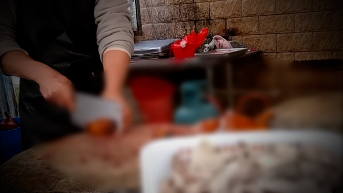 棚内亮着灯,门口有三四条烈犬巡逻,因为担心狗叫声会惊动屠宰窝点的人,记者没敢靠太近,但在简易棚周围的空气中记者可以闻到淡淡血腥味,听见铁笼反复打开的声音和猫的惨叫声。摸准窝点后,韩佳丽再次报警,并同步向农业农村局进行举报。
