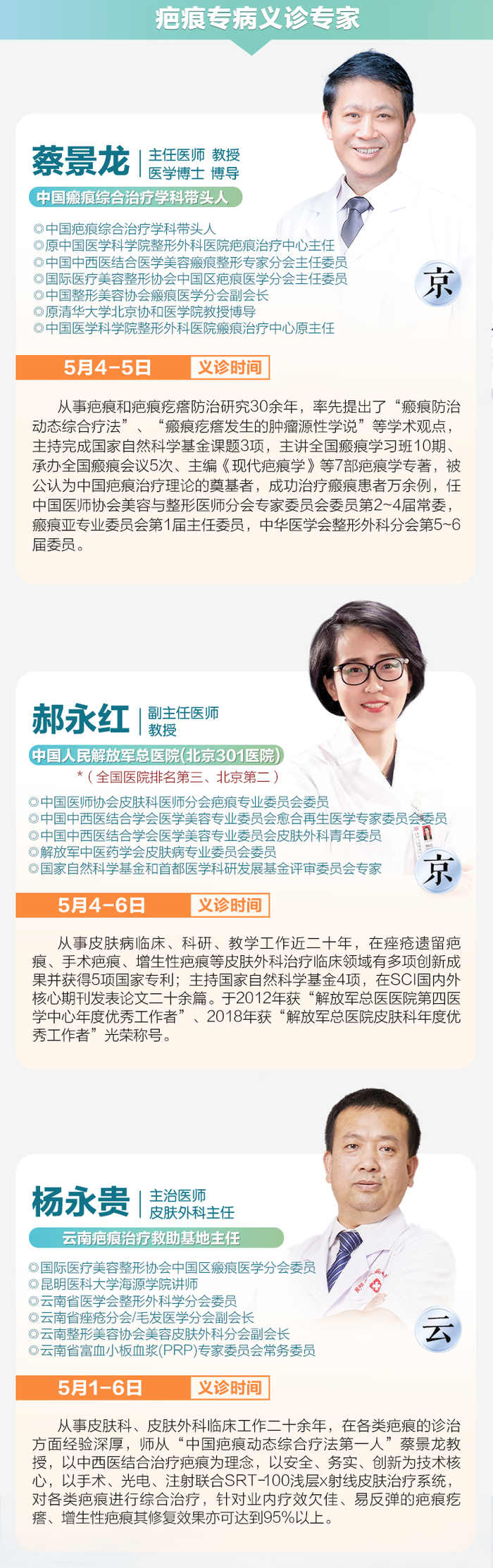 5月1-6日,北京疤痕疑难病例会诊中心首席专家蔡景龙、北京301医院(全国皮肤科排名第三、北京第二)皮肤外科专家郝永红、云南疤痕治疗救助基地主任杨永贵三位专家联合义诊,致力于为我省疤痕患者提供科学、有据、高效的诊疗保障,亦唤起大众对于疤痕、烧烫伤的预防与身心康复的关注,让身边的伤者、患者得到爱与帮助的同时,“百万心公益”将针对重症疤痕患者提供定向基金救助,让患者享受医保报销的同时再享基金援助政策,以切实减轻疤痕患者的看诊负担。