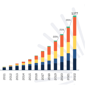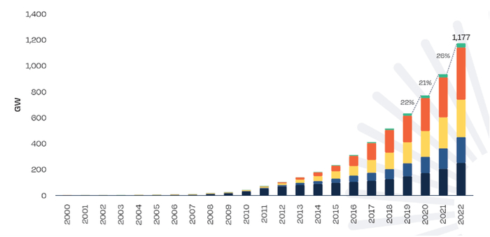 近年来,绿色低碳发展已经成为全球共识,各国也在加快光伏发电的投资建设。根据欧洲光伏产业协会数据,2022年全球累计太阳能光伏电站装机量为1177GW,同比增长25.21%。从2008年的15.8GW到2022年的1177GW,十四年累计增长超过73倍。