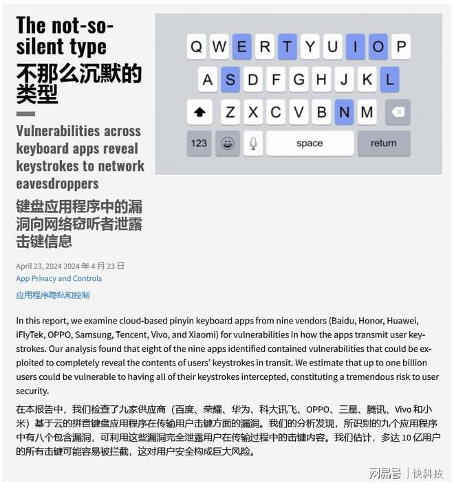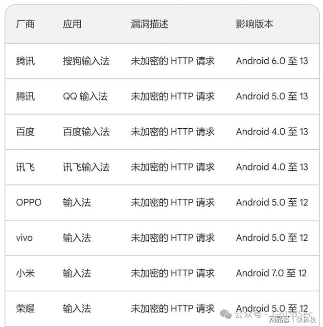 这家实验室分析了百度、荣耀、华为、科大讯飞、OPPO、三星、腾讯、vivo 和小米 9 家厂商的输入法,结果发现,除华为以外八家厂商的手机云输入法均存在严重漏洞。