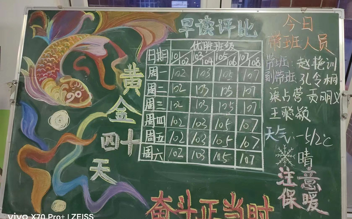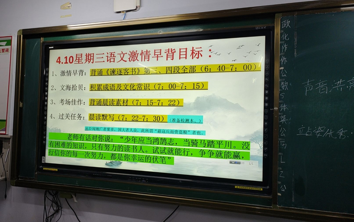 此时,每个教室的多媒体上已经呈现出了当天早读的安排:内容上或语文或英语;有目标要求;有检测标准;有激励话语。