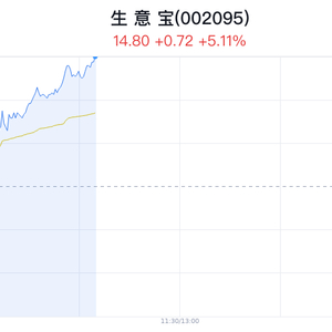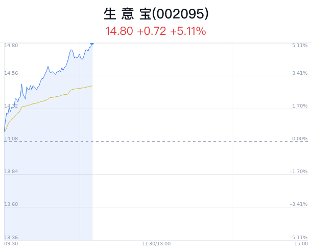 04月29日,生 意 宝(002095)股价大幅上涨,截至10点39分,生 意 宝上涨5.11%,报14.80元/股,成交4071万元,换手率1.12%,振幅5.68%。