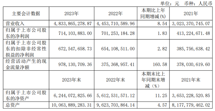 本报告期公司营业收入4,833,865,278.87元,较去年同期增长8.54%;营业利润为819,425,274.70元,较去年同期增长4.47%;净利润为711,607,623.17元,较去年同期增长1.63%;归属于母公司所有者的净利润为714,103,883.00元,较去年同期增长1.83%。公司通过生产管理优化、内部系统数字化升级、技术与工艺改善、供应链体系优化、节能降耗、组织内部培训等一系列的行动方案,推进了降本增效工作,力求全面提升内部的精细化管理水平,加强企业运行效率。