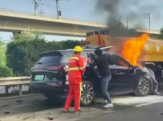 由途经事故现场车辆拍摄的视频可以看到,事故发生时,黑色的问界新M7左前方大部与洒水车右后方发生猛烈撞击,起火处位于引擎盖,有身着橙色制服和黑色T恤共两人通过砸破后车窗玻璃参与了救援。随后,火焰蔓延全部车身。