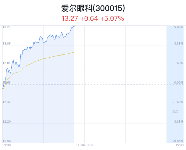 04月29日,爱尔眼科(300015)股价大幅上涨,截至11点14分,爱尔眼科上涨5.07%,报13.27元/股,创近1月新高,成交13.10亿元,换手率1.28%,振幅5.86%。