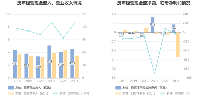 2023年,公司营业收入现金比为128.78%,净现比为-32.45%。