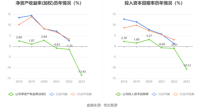 数据显示,2023年公司加权平均净资产收益率为-13.42%,较上年同期下降12.07个百分点;公司2023年投入资本回报率为-10.53%,较上年同期下降9.62个百分点。