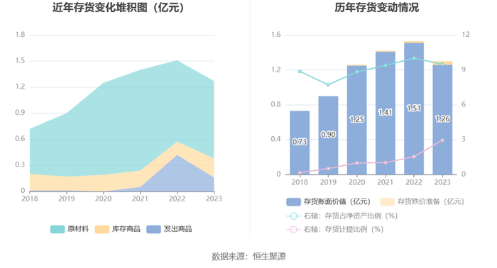 从存货变动来看,截至2023年年末,公司存货账面价值为1.26亿元,占净资产的9.5%,较上年末减少2511.74万元。其中,存货跌价准备为387.24万元,计提比例为2.97%。