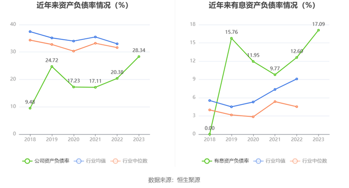 在偿债能力方面,公司2023年年末资产负债率为28.34%,相比上年末上升7.96个百分点;有息资产负债率为17.09%,相比上年末上升4.49个百分点。