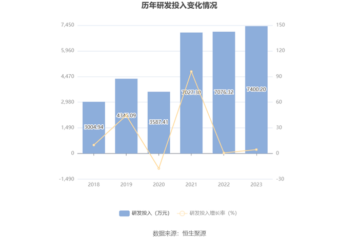 2023年全年,公司研发投入金额为7400.20万元,同比增长4.58%;研发投入占营业收入比例为21.08%,相比上年同期上升4.82个百分点。此外,公司全年研发投入资本化率为0。