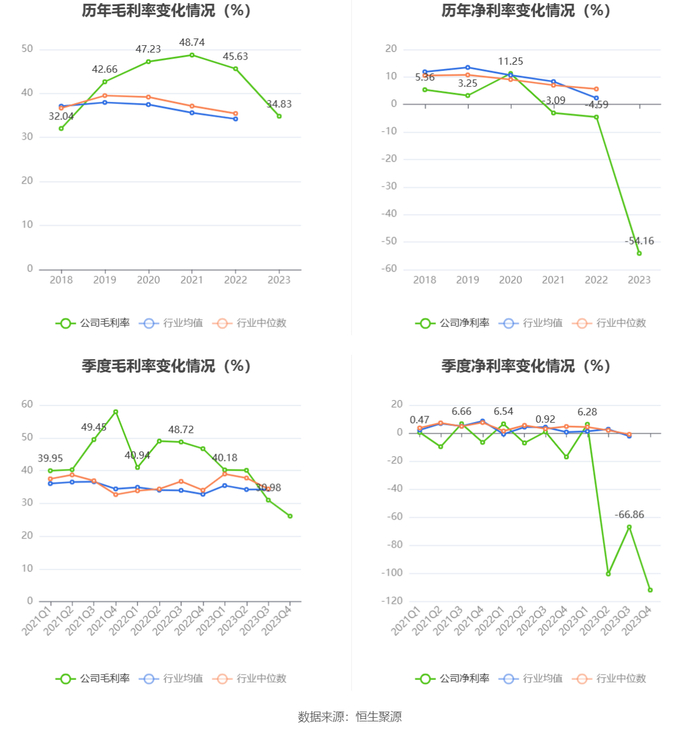 2023年,公司毛利率为34.83%,同比下降10.80个百分点;净利率为-54.16%,较上年同期下降49.57个百分点。从单季度指标来看,2023年第四季度公司毛利率为26.09%,同比下降20.58个百分点,环比下降4.89个百分点;净利率为-111.77%,较上年同期下降94.79个百分点,较上一季度下降44.91个百分点。