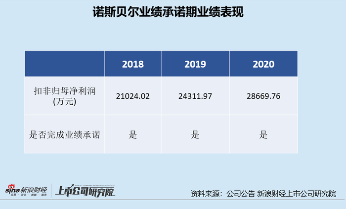 2018年-2020年,诺斯贝尔分别实现扣非归母净利润2.10亿元、2.43亿元、2.87亿元,累计实现扣非归母净利润7.4亿元,完成业绩承诺。