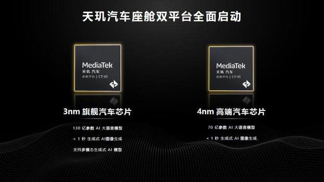 在天玑汽车座舱平台上最新推出的3颗芯片分别是CT-X1、CT-Y0和CT-Y1,前者应用了3nm制程,后两颗芯片则应用了4nm制程,将成为未来旗舰级汽车芯片和高端汽车芯片的代表。钛媒体APP分析认为,作为天玑座舱平台的算力基础,CT-X1的出现集中解决了当前智能座舱向AI座舱进化中的3个难点:数字化体验、AI部署、硬件协同。
