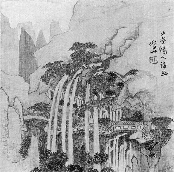 我们看傅山画的太原周边景物,如《西村夜色》《天门积雪》等,虽然只是淡淡勾勒,却只觉得冷逸幽深、苍茫寥廓。他的画中,也常有万丈飞泉的形象,如《山水花卉十六开》中的一幅,数道飞瀑倾泻而下,山石、长廊、红枫、翠柏都在飞流之下,虽是画在尺幅之上,但气魄宏大,惊心骇目。