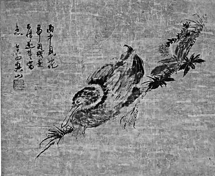 鸭子和身旁的野菊、杂草处于沿纸张对折的斜线上,呈现出不稳定的动势。画面笔墨草草,花草和鸭子却都神气宛然,显得朴厚苍拙。你可以从风雨中蹲伏的鸭子去解读窥测傅山的心境,可以联想到杜甫的《花鸭》诗:“花鸭无泥滓,阶前每缓行。羽毛知独立,黑白太分明”,也可从中来想象傅山刚介的为人。但是,傅山画它的时候,未必就是那样想的。他可能就是眼前有所见,随笔戏为之而已。他的笔墨气象,就是自己的心境,亦不用再去说明什么。