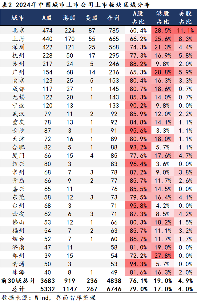 可以发现,前30名的城市中,一些城市的公司更倾向于在A股市场上市,如合肥、长沙、绍兴、台州以及南通,上市公司超9成为A股上市公司。而另一些城市则在美股或港股市场上市的比重相对更高,如北上广,海外上市公司占比超过30%。此外,杭州在美股上市的比重超过5%,相对较高。这种差异一定程度反映了当地的产业结构特征、企业国际化程度以及资本市场开放程度。