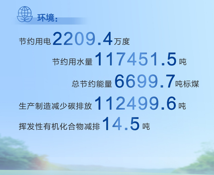 生产制造减少二氧化碳排放量112499.6吨,挥发性有机化合物(VOC)减排量14.5吨;