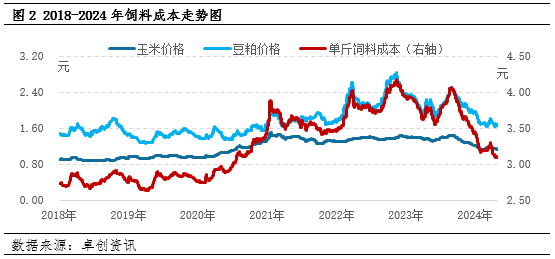 卓创资讯数据统计显示,截至2024年4月底,年内平均单斤鸡蛋饲料成本3.22元/斤,虽较2022年下跌16.15%,但较2021年前期平均水平仍上涨10%以上。
