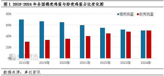 根据蛋壳的颜色进行分类,鸡蛋主要包括褐壳鸡蛋、粉壳鸡蛋、白壳鸡蛋以及绿壳鸡蛋等,其中褐壳鸡蛋与粉壳鸡蛋的产量一直居于首位,总占比高达90%以上,其中褐壳鸡蛋占比更胜一筹。卓创资讯通过对国内蛋鸡养殖行业研究分析发现,在2021年之前,褐壳鸡蛋占比以近70%的优势遥遥领先。但2021年以后,国内养殖单位饲养粉鸡的占比提升明显,直至2024年,褐壳鸡蛋与粉壳鸡蛋的占比基本接近1:1,粉壳鸡蛋占比提升明显,其主要受饲料成本上涨的影响。