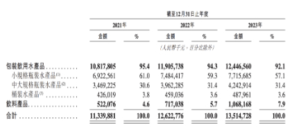 但事实上,这些产品并未在消费者心中形成认知,除在社交圈未能破圈外,从招股书数据来看,华润饮料的核心业务仍是怡宝水产品。招股书显示,饮料产品在华润饮料的营收中占比仅为7.9%,2021和2022年占比则更低,分别为4.6%和5.7%。