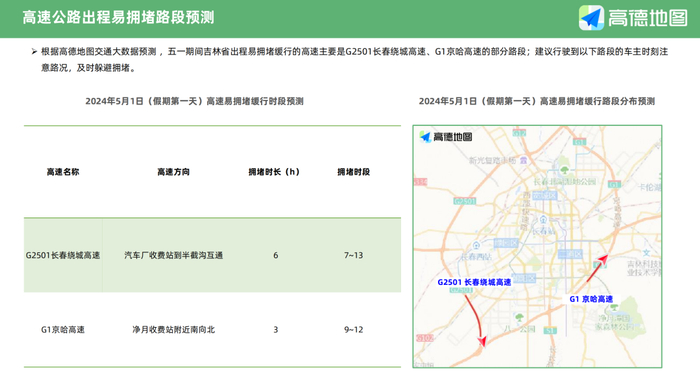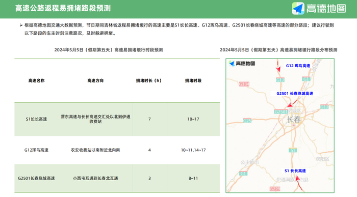 ➢ 根据高德地图交通大数据预测,节日期间吉林省返程易拥堵缓行的高速主要是S1长长高速、G12珲乌高速、G2501长春绕城高速等高速的部分路段;建议行驶到以上路段的车主时刻注意路况,及时躲避拥堵。