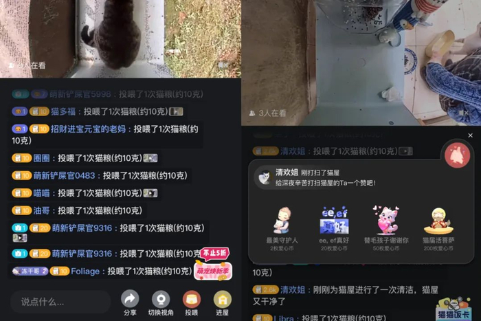 以街猫为首的平台正是看到了流浪动物救助的潜在市场,通过“直播+云投喂”的模式,打破传统的纯公益概念,将流浪猫喂养做成了一门“生意”。