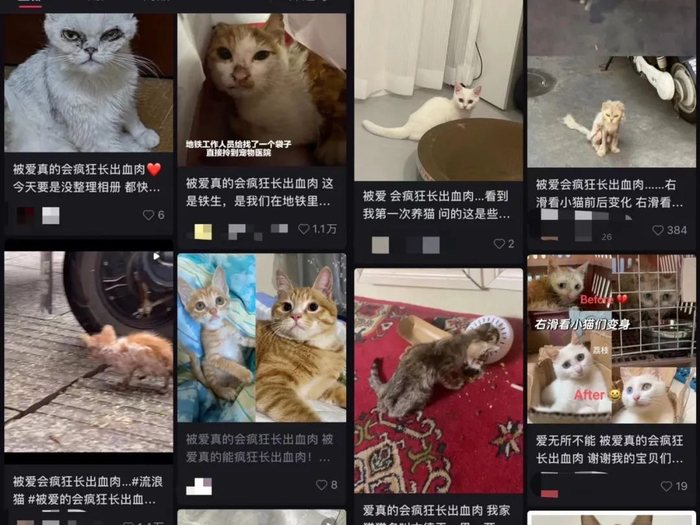 社交媒体上,有很多网友分享遇到流浪猫的经历、救助方法和心得笔记,“被爱会疯狂长出血肉”这句话成为了许多救助者的共同心声。那些曾经瘦弱不堪、眼神警惕又迷茫的猫咪,在得到救助后,被爱的力量所滋养,一天一天地健康活泼起来,毛发越发柔软,也开始信任人类。