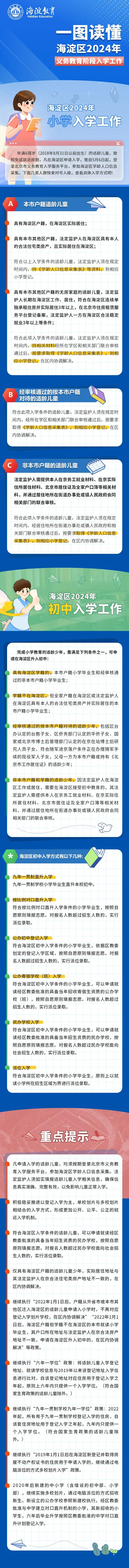 4月29日,2024年海淀区义务教育阶段入学政策发布。今年,该区入学政策总体不变,保持政策的稳定性和连续性。小学坚持以登记入学为主、单校划片与多校划片相结合的入学方式,小升初采取免试、按志愿派位的方式,积极优先解决区域内就近入学需求。