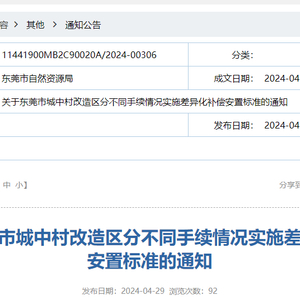 刚刚(4月29日),东莞市自然资源局官网发布了一则《关于东莞市城中村改造区分不同手续情况实施差异化补偿安置标准的通知》(以下简称《通知》)。